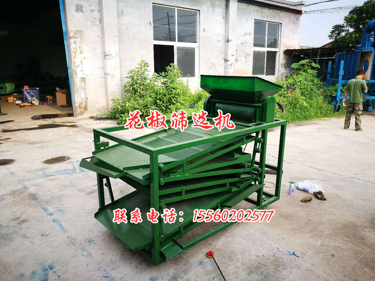 使用該機器可以把花椒中的籽、桿、葉、塵土等雜質分別清選出來,同時分出花椒顆粒等級,取代繁重的人工清選勞動。花椒清選機是專用于花椒脫粒、清選、分級、去雜的機械。 花椒篩選機及其他配套設備(提升機、皮帶機、絞龍、螺旋輸送機等)用途和特點:本機下方設有風機,可將從篩面流下的椒籽和花椒進一步風選分離,使篩凈率大大提高。